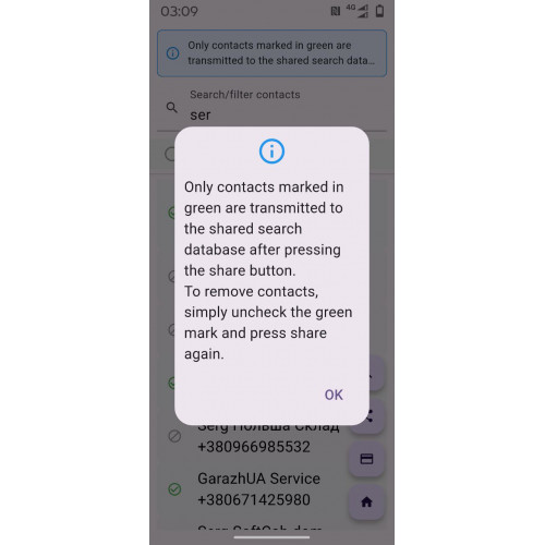 Для видалення контакту потрібно зняти відмітку з контакту, який ти, наприклад, помилково позначив та подiлився, та натиснути поділитися, і контакт миттєво вилучиться.